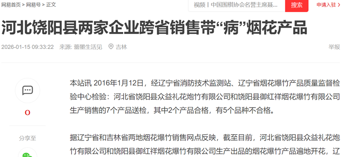 2016年1月12日,据辽宁省消防技术监测站、辽宁省烟花爆竹产品质量监督检验中心《检验报告》显示:共检测河北省饶阳县众益礼花炮竹有限公司和饶阳县御红祥烟花爆竹有限公司生产跨省销售的7个产品,别是“二踢脚”(升空)、“无敌双响炮”(升空)、“特制双响炮”(升空)“炮打菊花”(升空),“精制双响”(升空)“开门红”(组合烟花)“红红火火”(组合烟花)”等7款产品。其中,有2个产品合格: