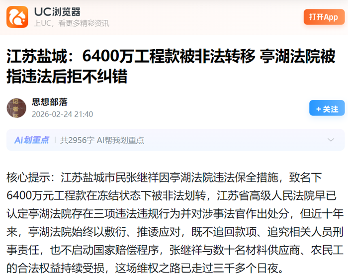 核心提示:江苏盐城市民张继祥因亭湖法院违法保全措施,致名下6400万元工程款在冻结状态下被非法划转,江苏省高级人民法院早已认定亭湖法院存在三项违法违规行为并对涉事法官作出处分,但近十年来,亭湖法院始终以敷衍、推诿应对,既不追回款项、追究相关人员刑事责任,也不启动国家赔偿程序,张继祥与数十名材料供应商、农民工的合法权益持续受损,这场维权之路已走过三千多个日夜。