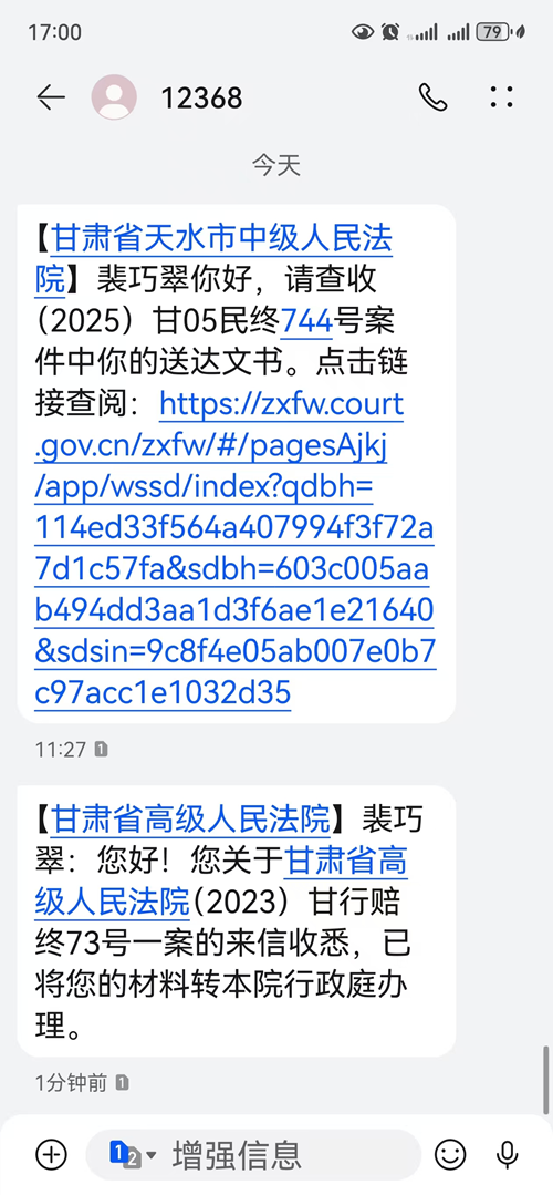 本站讯 到目前为止,裴巧翠仍在耐心等待甘肃省高级法院行政庭的信息反馈。8月19日,甘肃高院曾就她的信访事项通过12368平台发送短信通知,“已将您的材料转本院行政庭办理”。
