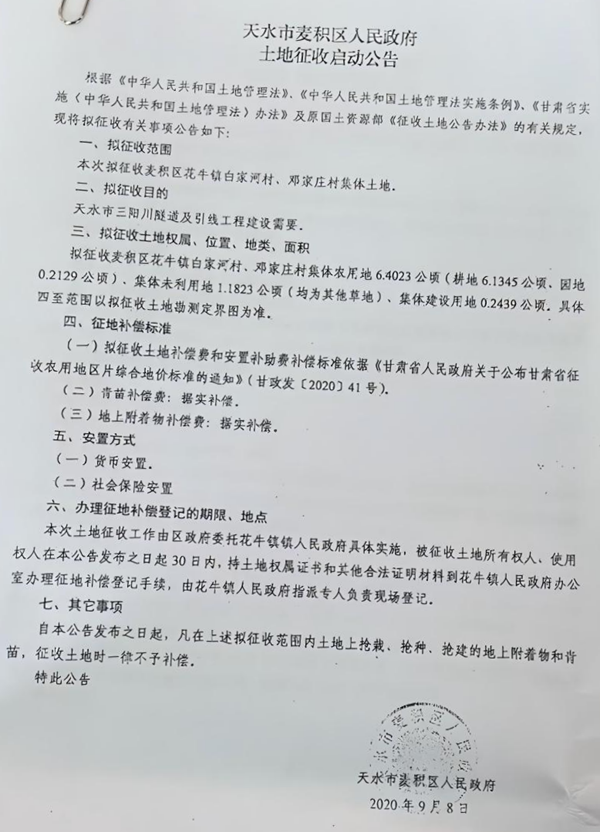 图为2020年9月8日发布的《土地征收启动公告》