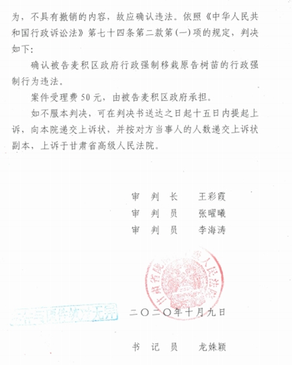 2020年10月9日,陇南市中级法院作出判决,确认被告麦积区政府行政强制移栽汇东公司树苗的行政强制行为违法。