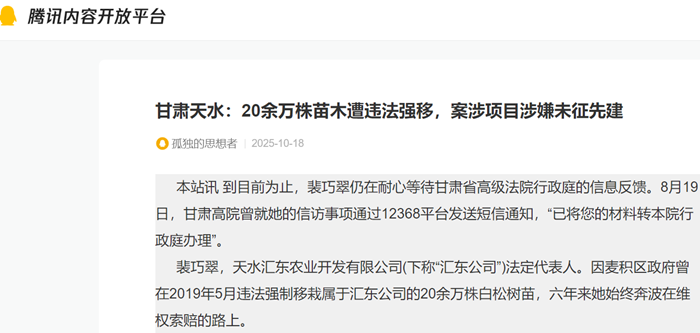 裴巧翠,天水汇东农业开发有限公司(下称“汇东公司”)法定代表人。因麦积区政府曾在2019年5月违法强制移栽属于汇东公司的20余万株白松树苗,六年来她始终奔波在维权索赔的路上。