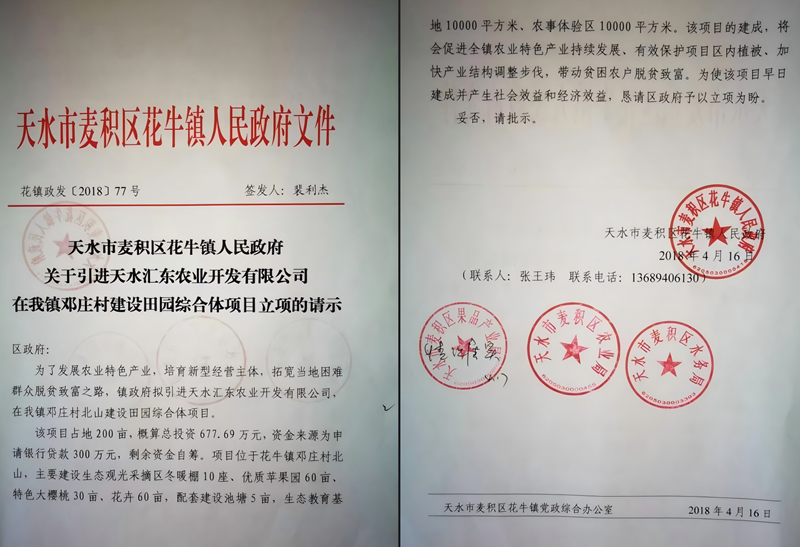 5月初,区农业局、果业局、林业局先后出具“同意立项”意见。麦积区颖川河流域综合开发区管理委员会按照区政府专题会议安排,与天水市规划局对接后,于5月8日向区政府反馈“原则同意项目建设”。5月10日,区住建局派专业技术人员现场勘查后,“原则同意该项目建设”,并提出:“该项目拟选址位于花牛镇邓庄村北山,该区域位于《天水市城市总体规划》范围之外,属村镇建设及农林用地。”