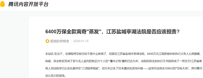 本站讯 在当下,法律程序空转已经不是什么新闻了,但是在江苏省盐城市亭湖法院,6400万元工程款被协助执行义务人公然隐匿、转移,保全款反而成了至今无人追究的陈正兴个人的“”囊中之物”攫利已达九年,法院的保全和执行文书居然成了一纸空文!江苏省高级人民法院早已认定此案存在"三项程序瑕疵",但九年过去了仍未撬动实质性纠错——这场司法保全与执行的"空转大戏",拷问着司法公信力的底线。