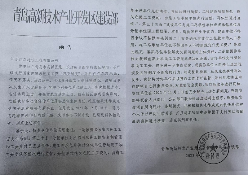 面对农民工的质疑,高新区建设部在答复意见书中称已采取多项措施:对总包、劳务单位进行信用考核处罚、全区通报,向企业总部发送警示函,管委会主要领导还亲赴南京调度案件化解,同时联合多部门约谈相关单位,城阳劳动监察大队也已介入并作出行政处罚。但在农民工看来,这些举措全是“空头文章”,史建军等农民工表示,每次反映问题,相关部门只会给出内容雷同的答复,连标点符号都不改,从未真正采取有效措施解决实际问题。