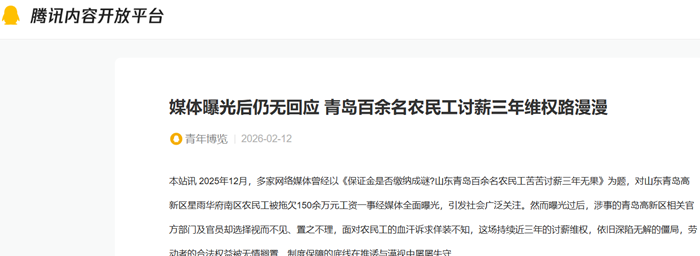 本站讯 2025年12月,多家网络媒体曾经以《保证金是否缴纳成谜?山东青岛百余名农民工苦苦讨薪三年无果》为题,对山东青岛高新区星雨华府南区农民工被拖欠150余万元工资一事经媒体全面曝光,引发社会广泛关注。然而曝光过后,涉事的青岛高新区相关官方部门及官员却选择视而不见、置之不理,面对农民工的血汗诉求佯装不知,这场持续近三年的讨薪维权,依旧深陷无解的僵局,劳动者的合法权益被无情搁置,制度保障的底线在推诿与漠视中屡屡失守。