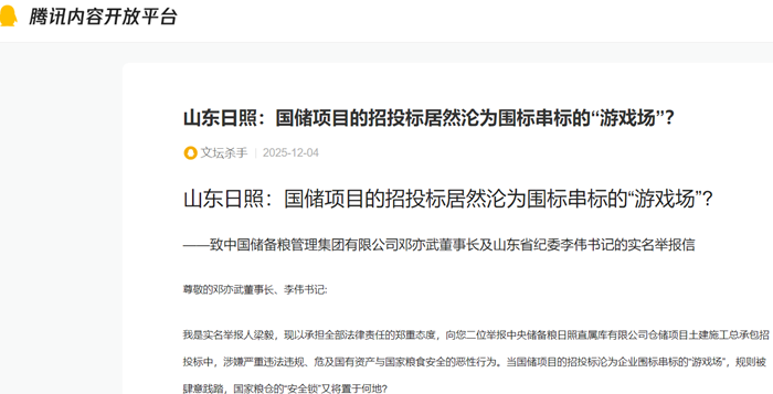 我是实名举报人梁毅,现以承担全部法律责任的郑重态度,向您二位举报中央储备粮日照直属库有限公司仓储项目土建施工总承包招投标中,涉嫌严重违法违规、危及国有资产与国家粮食安全的恶性行为。当国储项目的招投标沦为企业围标串标的“游戏场”,规则被肆意践踏,国家粮仓的“安全锁”又将置于何地?