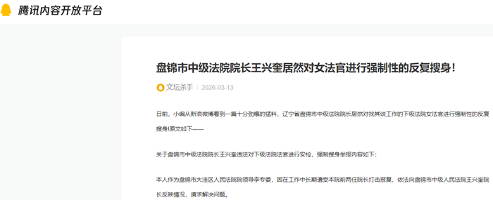 在本人前往汇报反映问题之前,中院在已进行正常安检的情况下,盘锦市中级法院院长王兴奎于2026-2-11在无任何法律手续的情况下仍强行要求女工作人员对本人进行全身各个方位搜身检查,且在十余位法院干警在场围观的情形下实施。